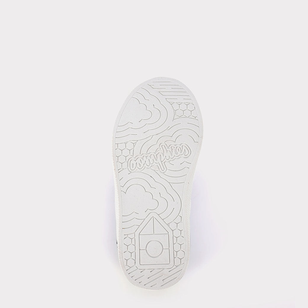 Meet the Robin. Instead of laces, Robin is outfitted with an elastic strap that sits under the eyelets, and right above the tongue for a secure fit. All Oomphies come with a foam cushion footbed, this set in particular matches the same color of the upper, built on top of our flexible Oomphies outsole. These kid favorite shoes are stylish, practical and functional! Oomphies kids' shoes are kid-friendly and parent approved!